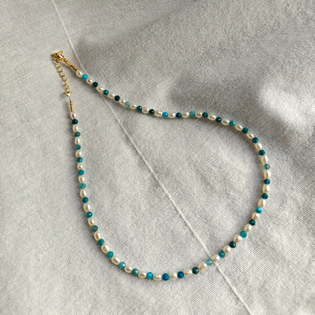 Handmade choker necklace with fresh water pearls and semi precious stones.