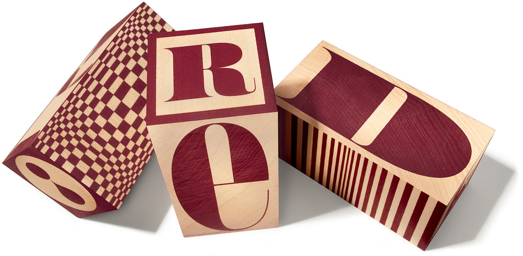 House Industries typographic elements artfully squeezed, stretched and cubed into Uncle Goose’s handmade hexahedrons then peppered with patterns provide aesthetes of all ages alphanumerosymbolic enlightenment.